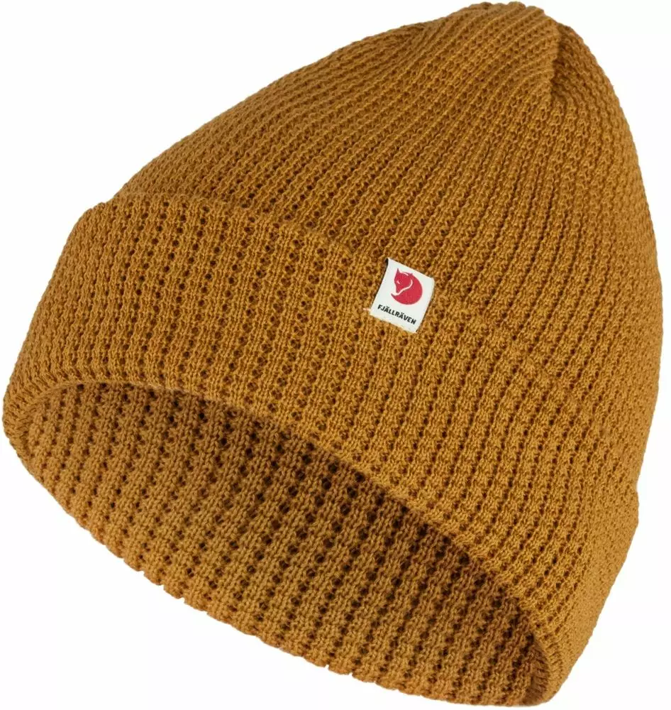Fjällräven Tab Hat Acorn is a soft and comfortable knitted beanie made from recycled polyester. The beanie features a beautiful waffle knit and a wide fold-up edge. It also has a small textile logo. The material is designed to wick moisture away from the skin and dry quickly, making it an excellent choice for both everyday use and mountain hiking.
