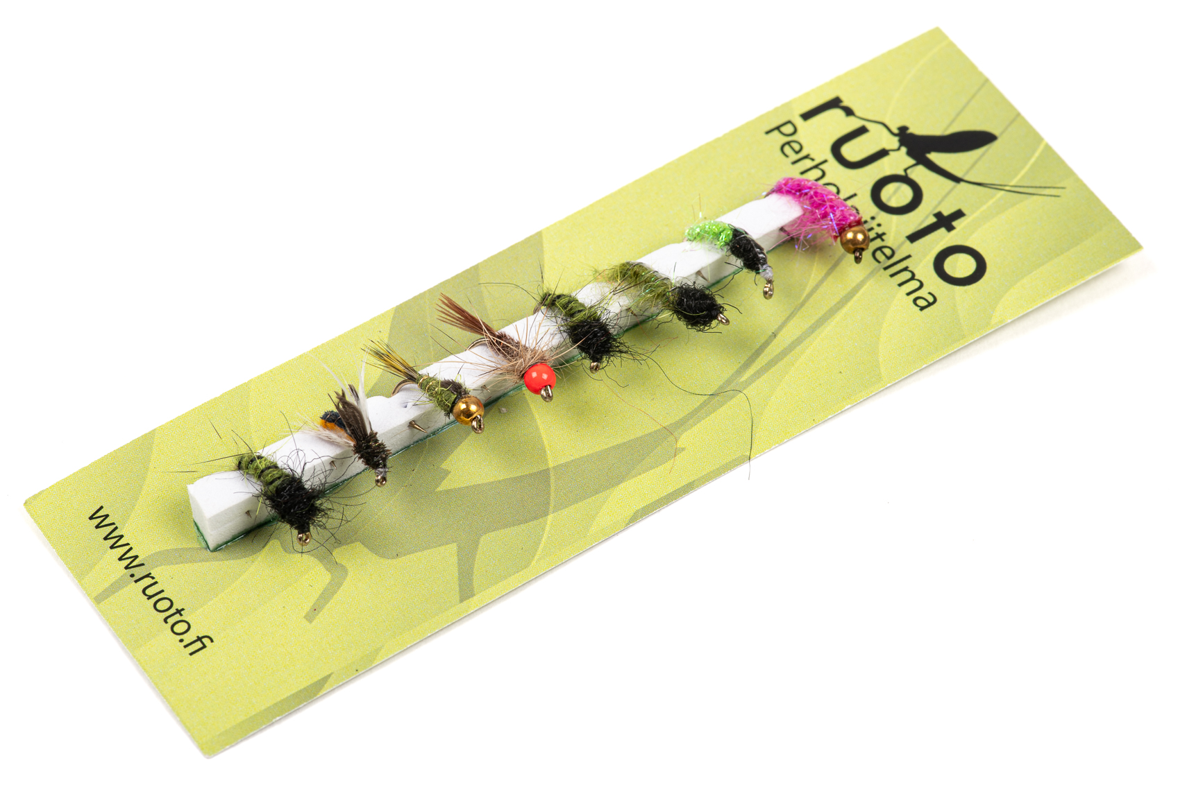Ruoto Fly Selection Larvae and Pupae is designed for fly fishing, especially for grayling and trout fishing. This selection includes eight different flies that imitate larvae and pupae. Such flies are effective because they resemble the natural food of fish in the water. The selection offers a diverse range of flies suitable for various fishing situations and conditions.