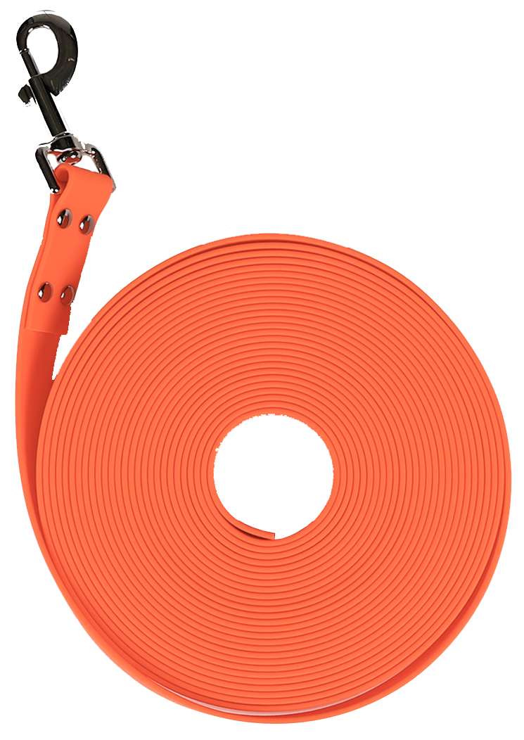Hundra Training Tracking Line, Wide is a wide, handleless, and durable tracking line designed for heavy use. It is made of weather-resistant PVC material, which is easy to keep clean. The line features a galvanized metal pistol lock and is reinforced with double rivets, enhancing its durability. The orange color makes the line highly visible in the terrain.