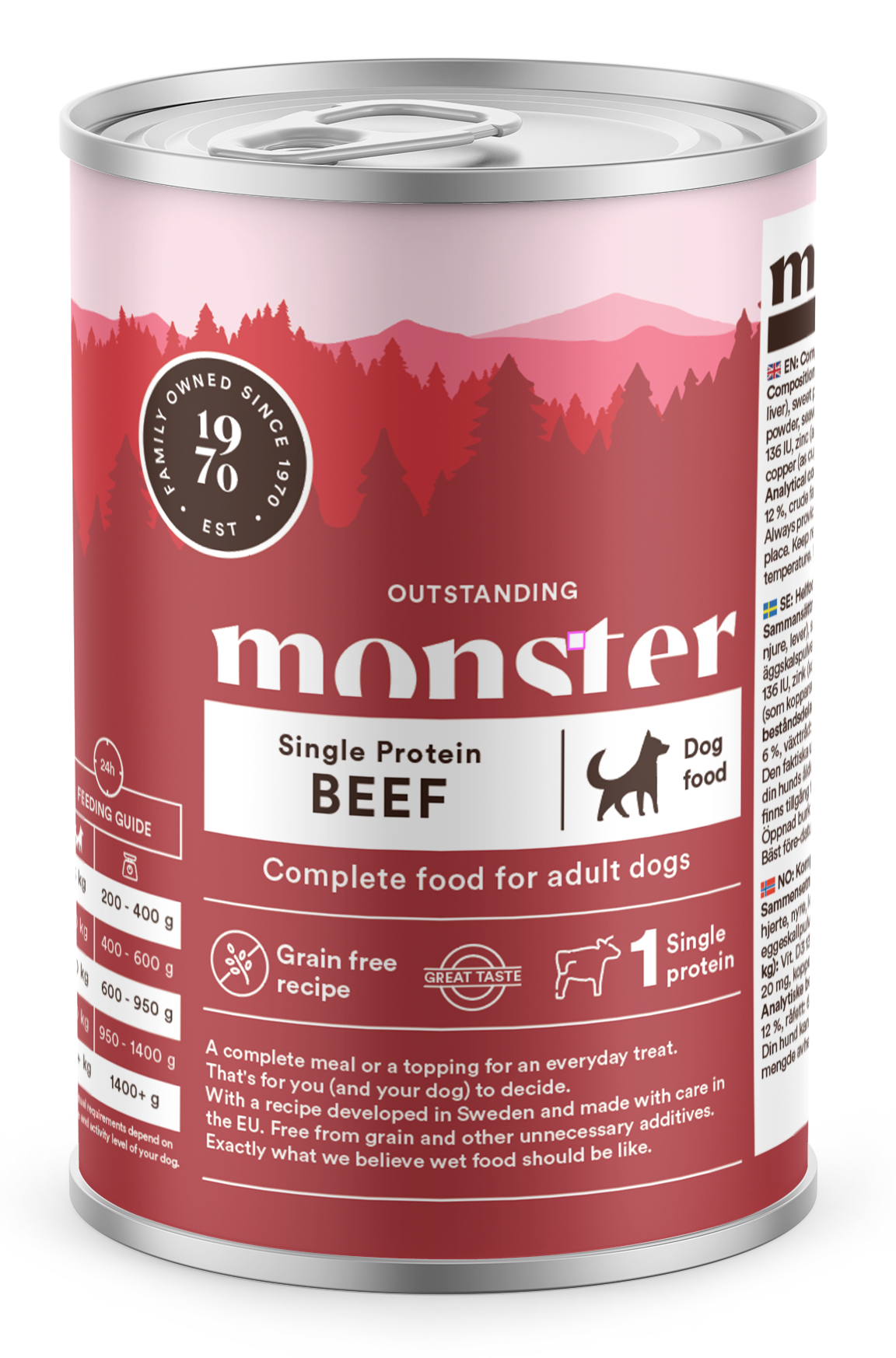 is a 100% grain-free, high-protein, and meaty canned food that contains delicious beef. It can be used either as a complete meal or as a small luxury in everyday life. The product is developed in Sweden and made from carefully selected ingredients – without unnecessary additives.
