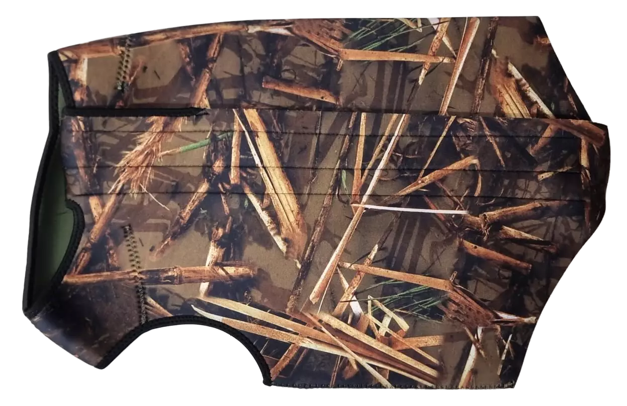 Nordhunt Dog Vest Camo is a dog safety vest designed to protect your dog from the cold both on land and in water. The vest is made from flexible 4 mm thick neoprene, making it comfortable and warm. The exterior features a camo pattern, giving the vest a stylish appearance. The vest is secured on the back with a strong zipper and Velcro, ensuring it stays well in place. All front edges have binding tape, which adds comfort and prevents chafing.