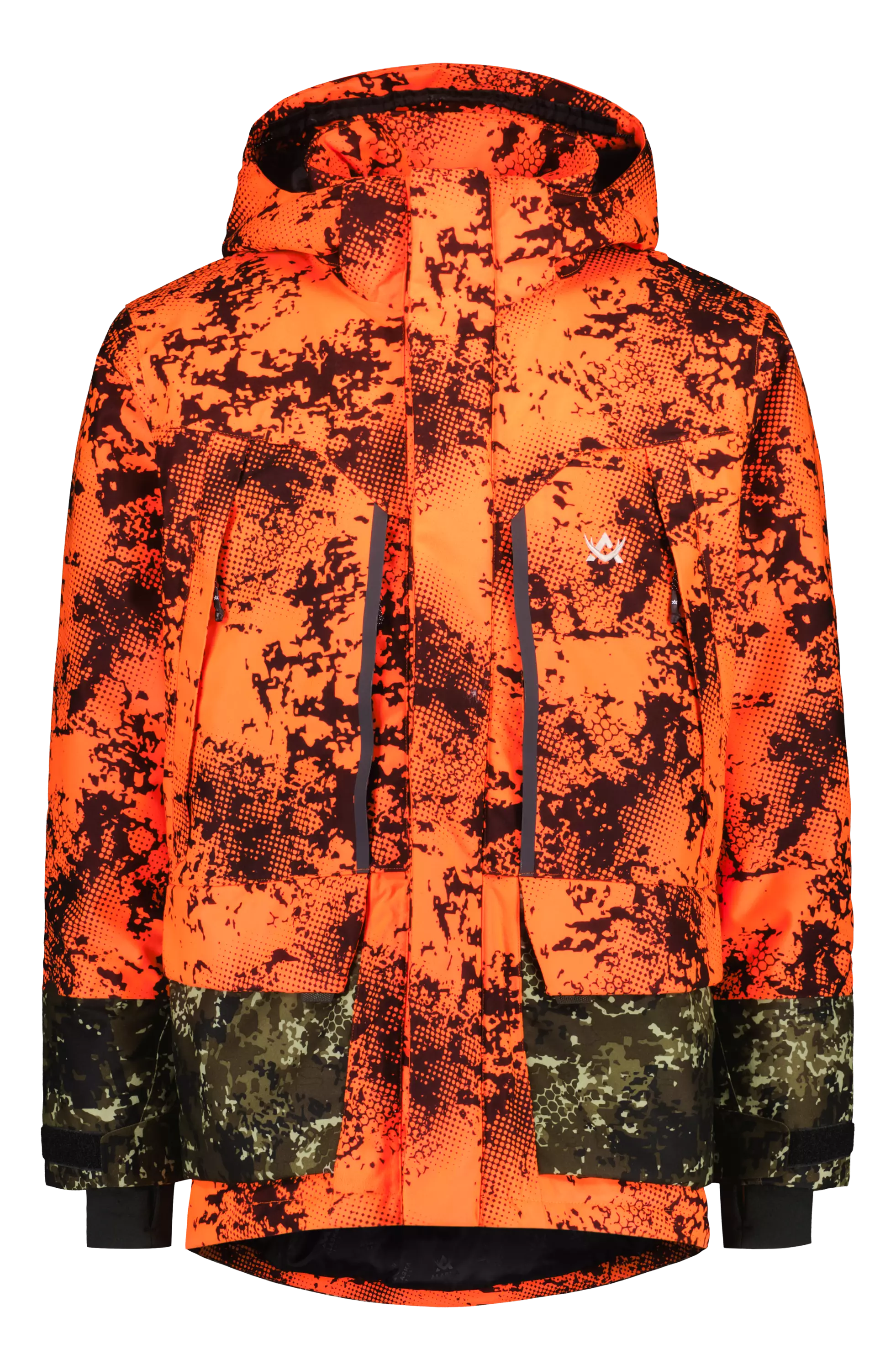The Alaska Tundra Mens Jacket Blaze Blur is an eco-friendly choice, as 85% of its outer material is made from recycled polyester. The jacket is specifically designed for hunting in cold weather conditions, and its Blaze Blur color combines high-visibility colors with camouflage.
