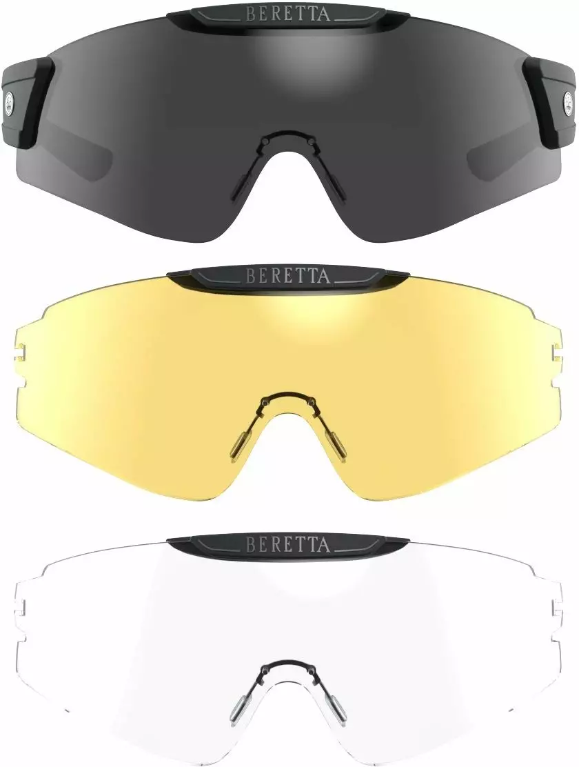 Beretta InterMask Fume' & Neutral & Yell shooting glasses are versatile protective eyewear specifically designed for shooting. The glasses come with three interchangeable lenses: black, clear, and yellow. These lenses provide excellent visibility in various weather conditions. The glasses feature an adjustable nose bridge, allowing for a customized fit to the user's face. This ensures the glasses stay comfortably in place, offering optimal protection and comfort during shooting.
