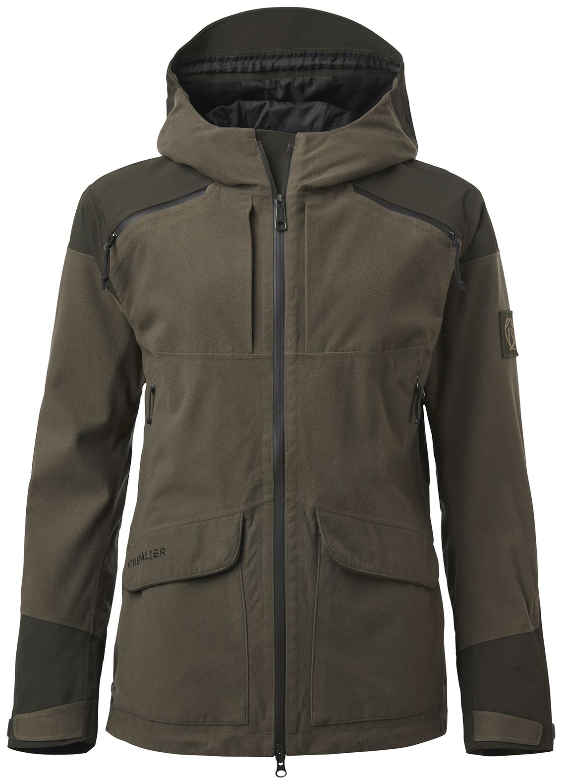 Chevalier Pointer Chevalite Jacket 3.0 for women is a silent, supple shell jacket in brushed stretch material. This hunting jacket is waterproof and windproof thanks to our Chevalite membrane, and the fact that all the seams are taped. On the front is a water-repellent two-way zipper by YKK. The Pointer 3.0 jacket features a range of practical functions, including spacious fleece-lined pouch pockets, bellowed pockets with fleece lining, double radio pockets and a generous back pocket. There is a zippered inside pocket for storing keys and other items. This shell jacket offers great ventilation options, with a two-way zipper at the front and zippers under both sleeves. A snap on the front hem keeps the jacket’s front sections in place, even when the front zipper is open for ventilation. The jacket is designed for activity and motion with its soft stretch material and ergonomic fit, which includes articulated sleeves. Reinforcement fabric on the shoulders and elbows. The cuff and hem width is adjustable. The jacket has a generous hood with two-way adjustment, and it can be cinched around the head easily with one hand. The main material and the two different liner fabrics are made from recycled polyester.