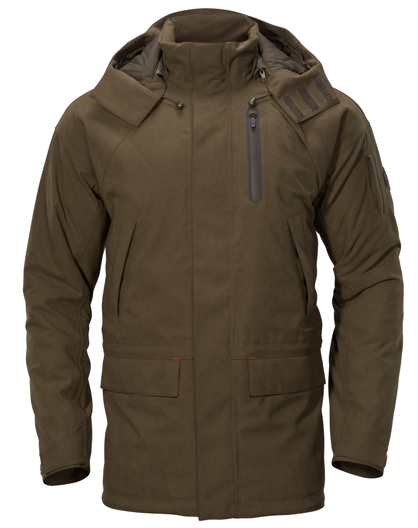 On the left upper sleeve is a small pocket with a sewn-in reflective armband, red on one side, orange on the other, that fastens easily around the arm. The Driven Hunt HWS Insulated jacket has two slanted handwarmer pockets, and two large front pockets with flaps, with low-noise magnetic closures. A cartridge holder is sewn into the right-hand front pocket. The jacket’s main two-way zip is covered by a windproof and waterproof flap with low-noise, rubberised press studs. There is an inner pocket, the hood is removable, and there are elasticated drawstrings on the hood, at the waist and on the lower hem.
