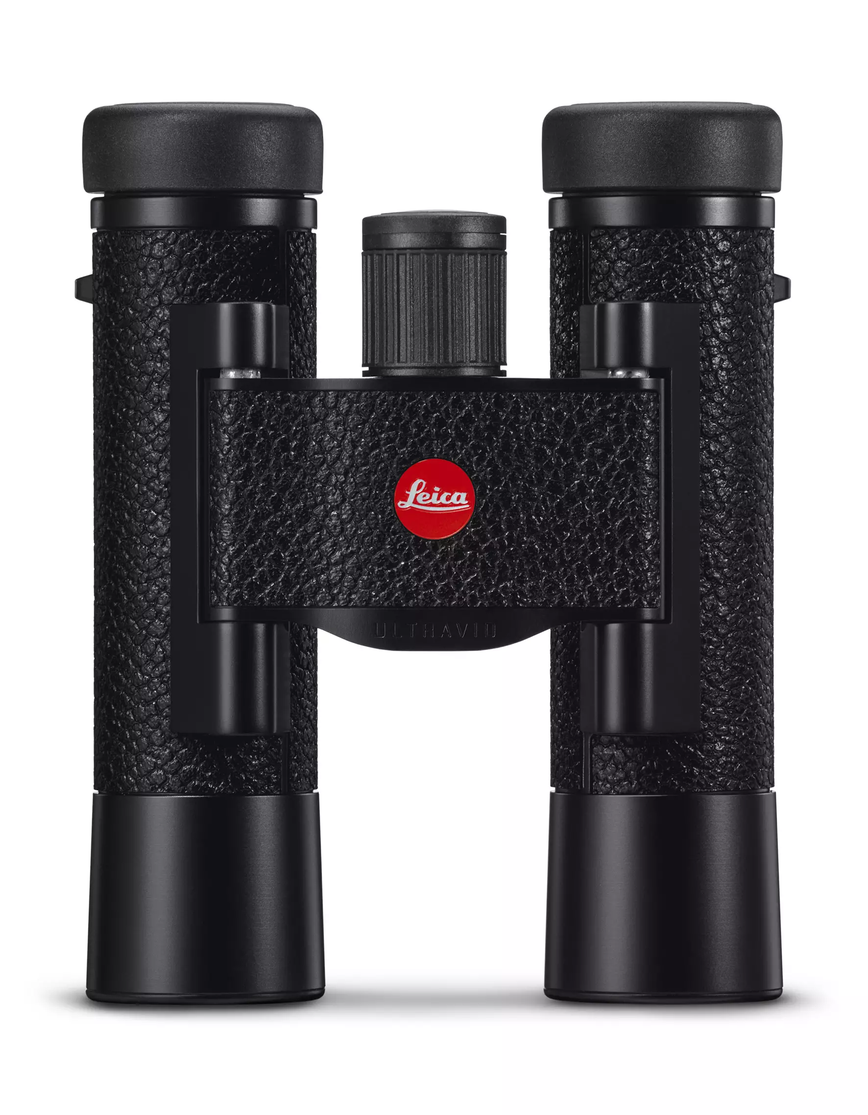 Leica Ultravid 10x25 leathered, black binoculars are compact and high-quality binoculars that offer excellent performance. They are black and leather-covered, and their order number is 40607. The package includes a woven carrying strap, eyepiece covers, and a leather protective pouch.