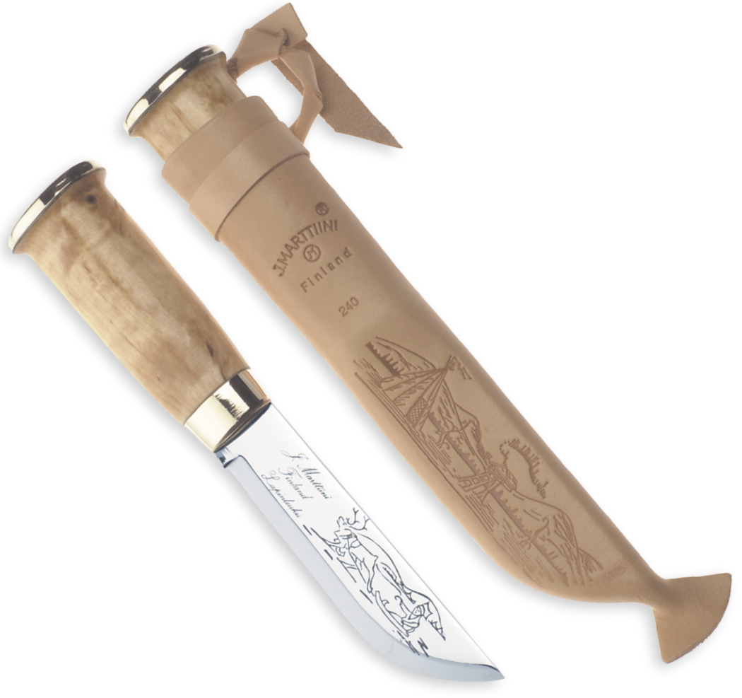 The Lapp knife 240 is one of Marttiini's most popular knives and continues to maintain its place at the top of the sales ratings after many years of continuous production. The knife is excellent for hikers and hunters who are active knife users, and it also makes an ideal present or souvenir from a trip to Finland. The stainless chrome steel blade features a beautiful etched engraving depicting a Lappish theme, whilst the pattern on the sheath also reflects a strong Lappish heritage.