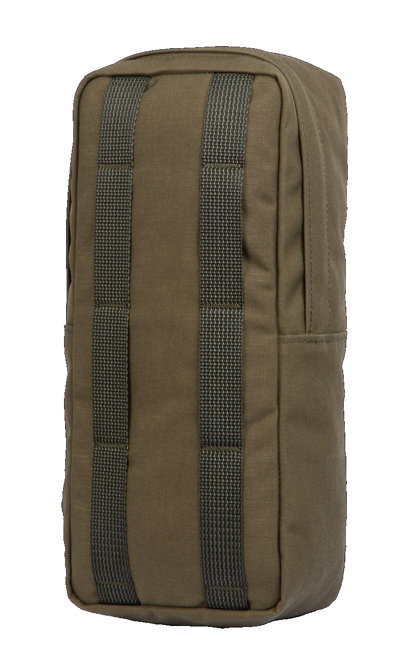 The rear features our standard PALS attachment webbing system with tuck tabs. The middlemost horizontal webbing rows were eliminated as they didn’t really do anything besides add weight. We aren’t a ultralight gear manufacturer, but even we don’t like unnecessary weight. Optimal attachment requires a width of three channels and a height of five (min. four) rows of PALS webbing. Your packs side compression straps will, when tightened down, eliminate any movement of the pouch and its contents. The 4L side pouch fits all of our Jääkäri series packs.