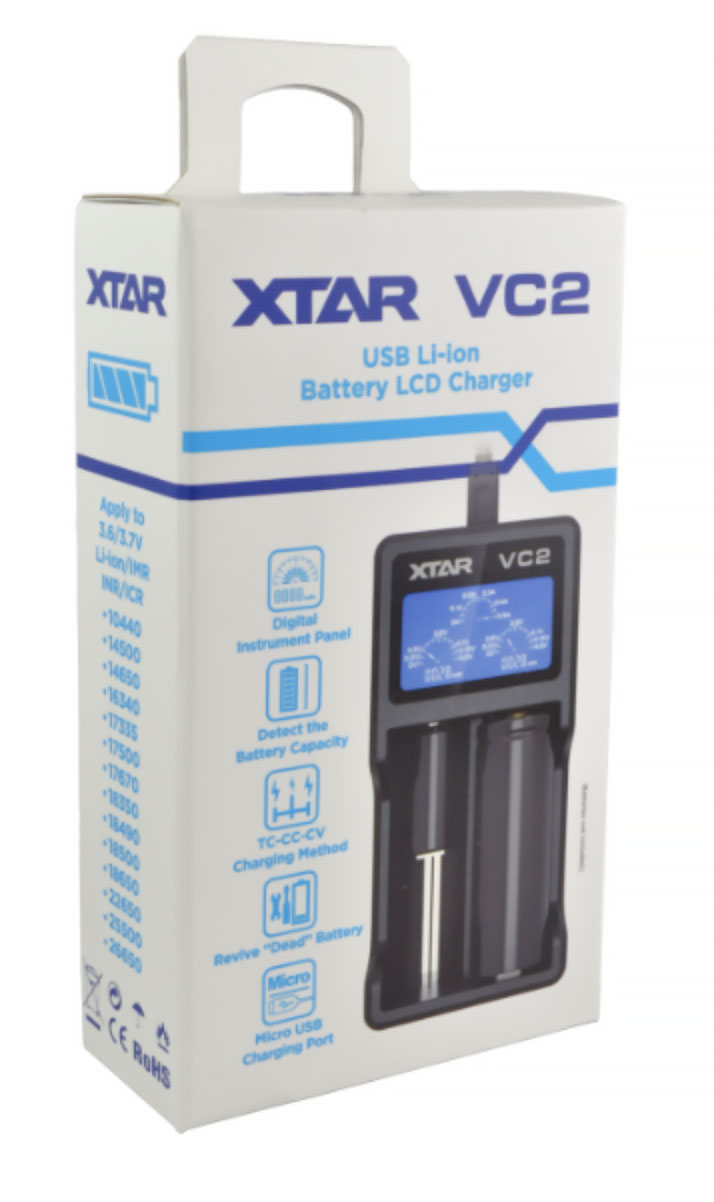 Xtar VC2 - is fully automatic Li-Ion charger with LCD display. LCD Screen display each battery real time status including charging current, battery voltage, battery charged capacity and you can identify batteries capacity. Built-in high-precision MCU and real-time temperature control protection system, with over-current protection, over-charge, over-voltage, and short-circuit protection.