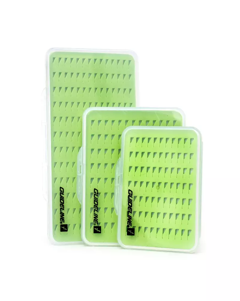 Sammanfattning: denna ask passar användaren som värdesätter lätthet, platt profil och tydlig organisering av flugor. Tre storleksalternativ ger flexibilitet, och den gröna slit-foam-basen underlättar fästning och hittande av flugor när utrustningen ska hållas organiserad.