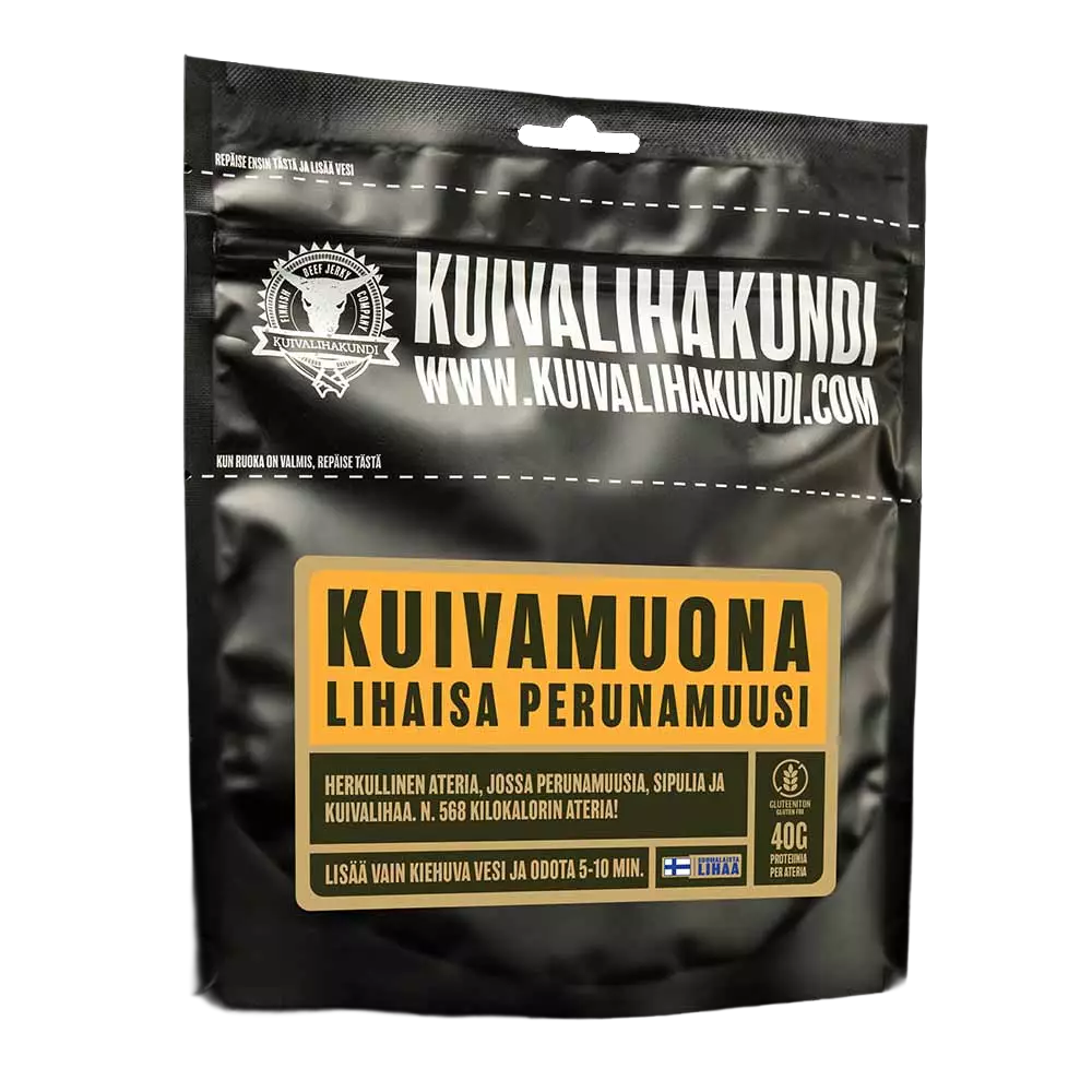 Kuivalihakundi Dry Food Meaty Mashed Potatoes 135g is the perfect choice for a demanding taste. This ready meal is specially designed for outdoor activities and hiking, offering plenty of protein and energy. The mash contains approximately 40g of protein and 568 kcal of energy per serving, making it an excellent energy source for long-lasting activities.