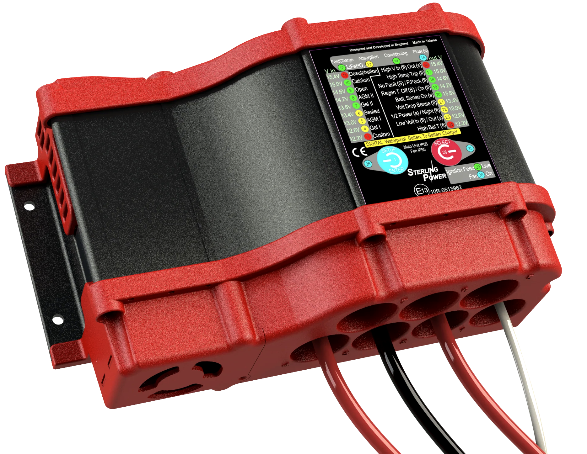 SterlingPower 12V 36V 30A Waterproof Battery to Battery Charger - aluminium housing, a water resistant fan and our most efficient waterproof DC/DC board yet provide you with the best waterproof service we can provide. Comes sealed with pre-wired 1.5m long cable, and with pre-installed fuses and fuse holders on the cables. Along with all of the features present in the Pro Batt Ultra range of battery to battery chargers.