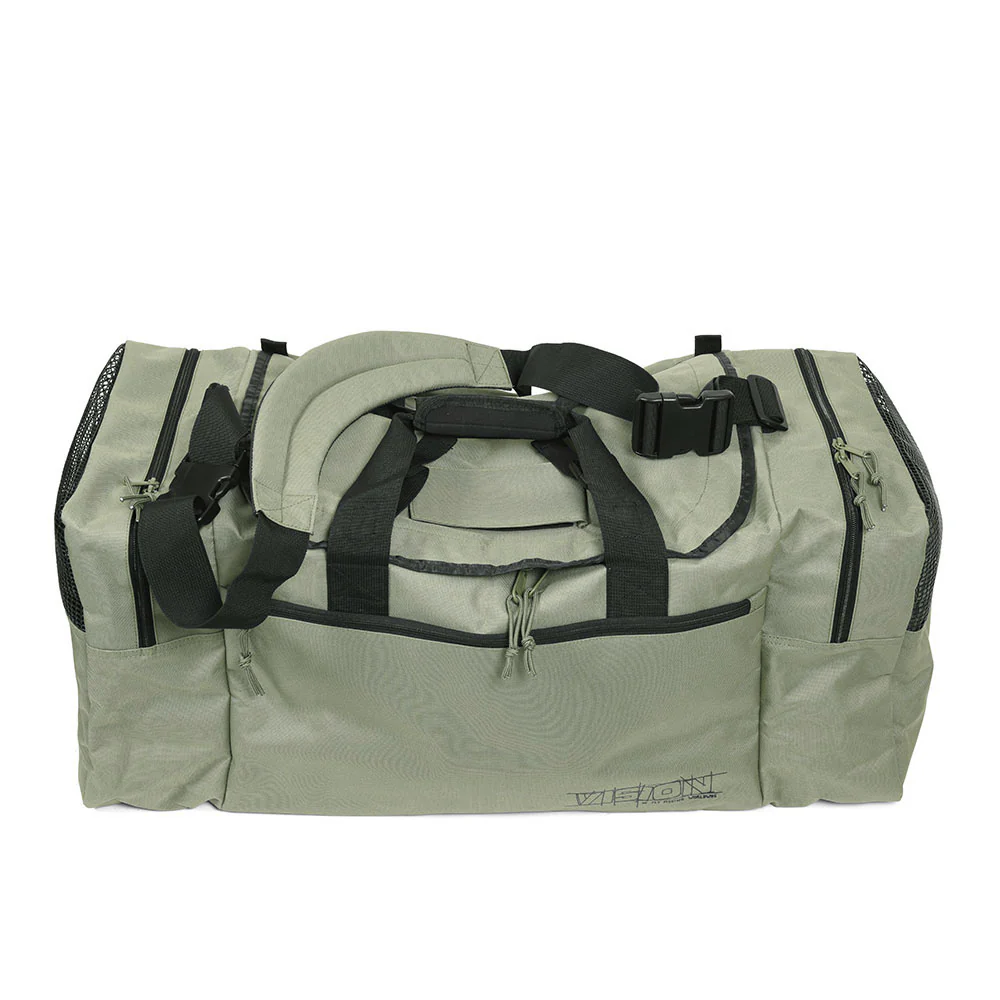 Vision All In One is constructed of tough and durable 600 Denier Oxford polyester cloth, this bag offers the features you need. It has a large main compartment for clothing with a U-shaped zippered entry for dry storage. Mesh storage pockets inside the main compartment with elastic retainer straps hold tackle. Two generous end compartments with drain holes and mesh uppers hold wet waders and boots for drying. The bag is also equipped with a large side pocket for accessories.