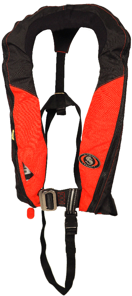 - The vest has an adjustable waist strap, crotch strap, and oral inflation tube.