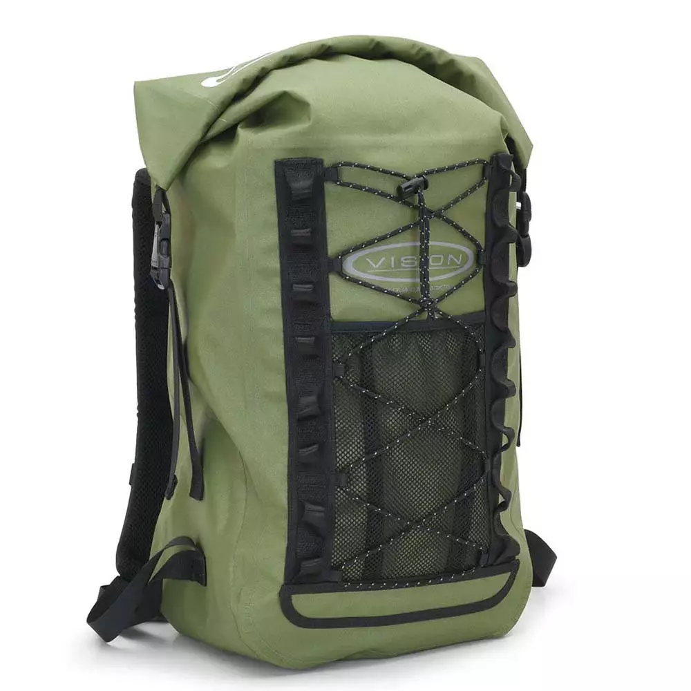 Vision Aqua Day Pack 35L Olive – a waterproof backpack designed to keep your gear dry during fishing trips or other outdoor activities. The backpack has a capacity of 35 liters and is made of durable PU-coated nylon.