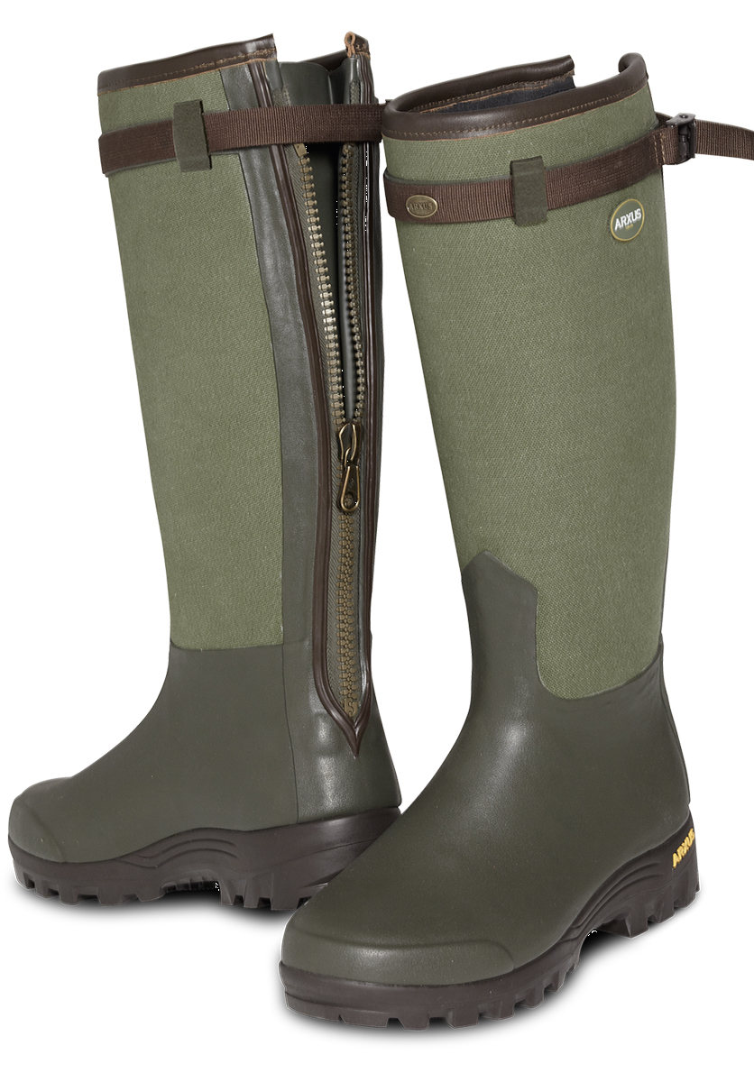 The boot has a lower weight due to the canvas reinforcing fabric and thus has a slightly thinner rubber thickness of 1.8 mm rather than 2.0 mm which is standard for the other Arxus rubber boots. Direct boot penetration leg injuries can be avoided more efficiently due to the canvas design on the boot shaft.