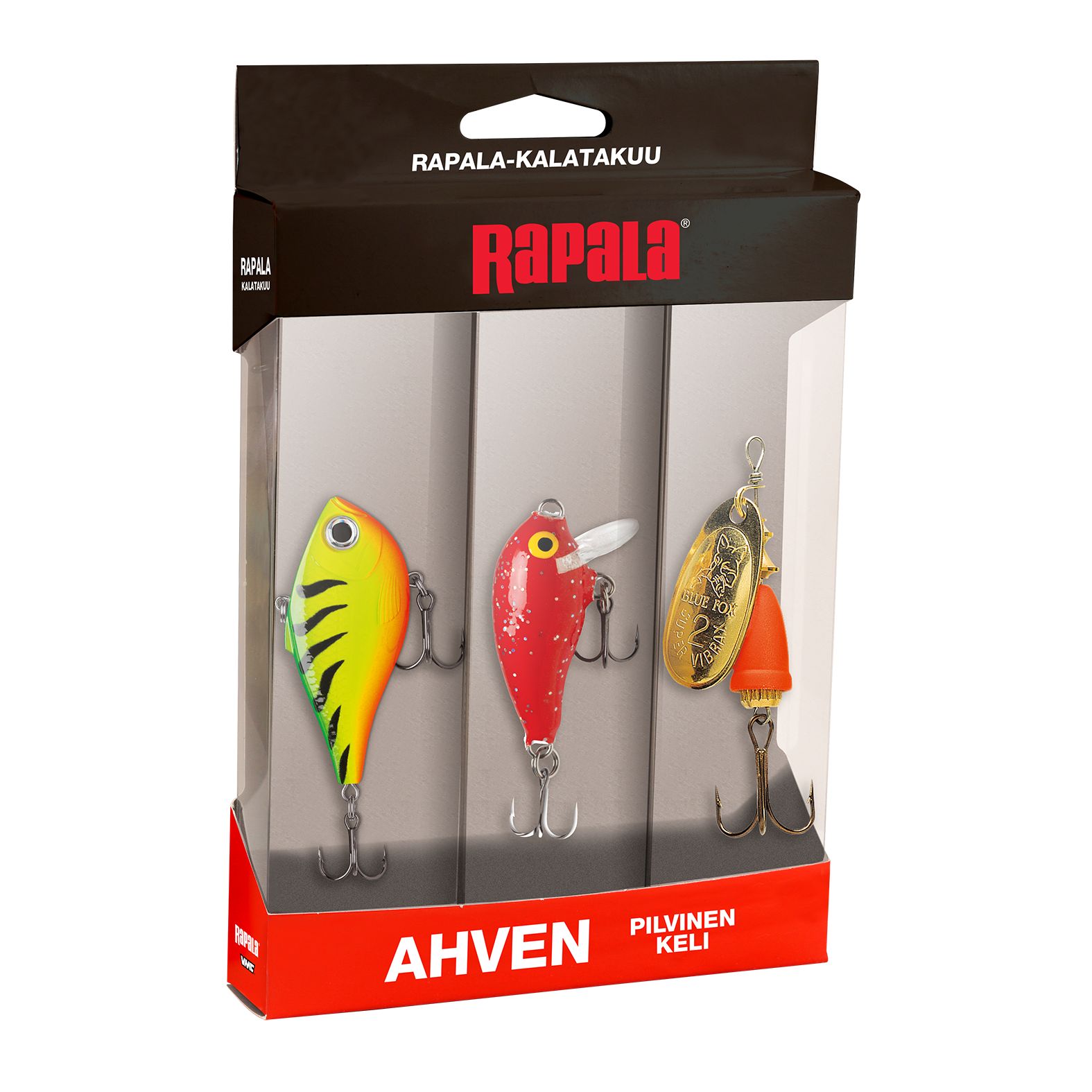 The lure set includes Rapala's guaranteed catch lures with colors that are easily visible in cloudy weather and low light. Includes: Rapala Rippin' Rap 5cm, Rapala Mini Fat Rap, Blue Fox Vibrax Fluorescent.