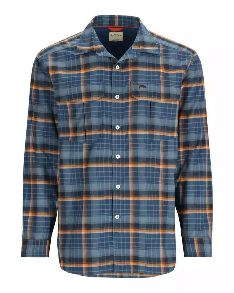 Simms ColdWeather Shirt Neptune/Sun Glow Ombre Plaid flannel shirt with fleece lining offers warmth and comfort for winter fishing. The shirt is designed to be durable and keep you warm even in cold conditions.