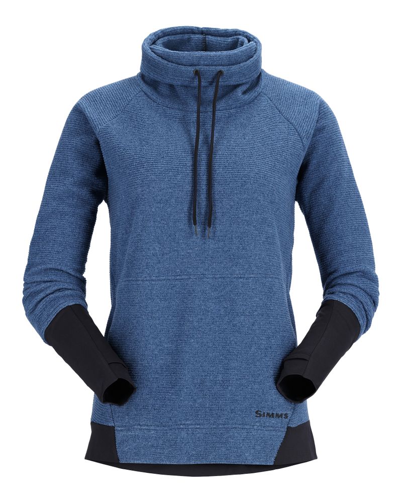 Simms Women's Rivershed Sweater is nice and cozy fleece hoody for on and off the water. High-performing jacquard fleece standout that pairs perfectly under waders or a jacket and provides the additional coverage of a tall, plush drawstring collar.