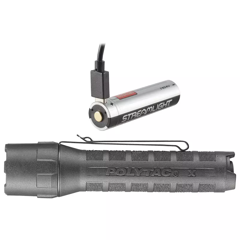 Streamlight PolyTac X USB Black – a compact and durable flashlight designed for versatile use. This tactical flashlight offers up to 600 lumens of light output and features a multi-fuel system, allowing it to be powered by either a rechargeable SL-B26 battery or two CR123A lithium batteries.