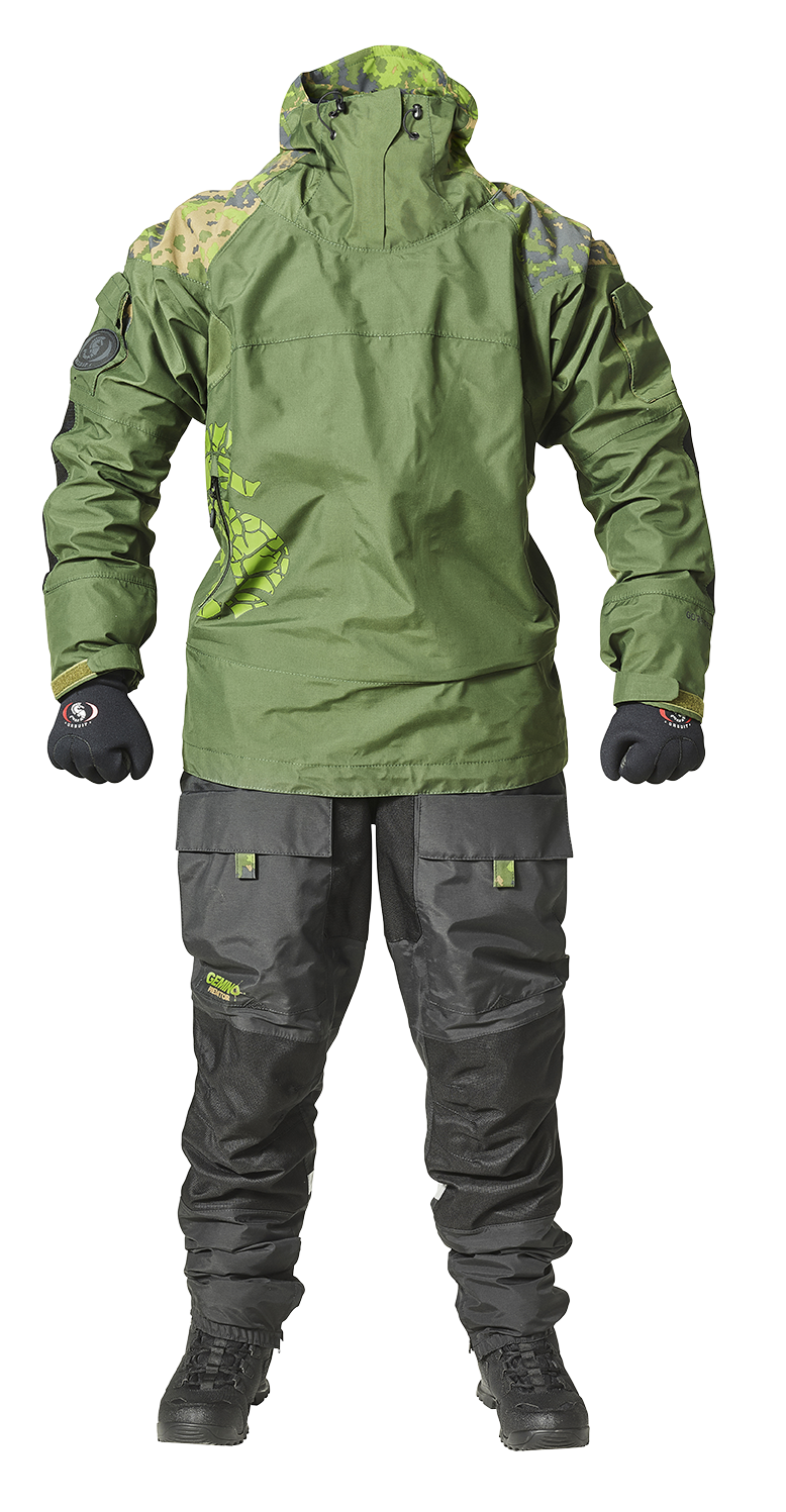 Ursuit Gemino Predator is a two-piece dry suit specifically designed for hunting and fishing. The suit is made from high-quality Gore-Tex® Taslan material, which is lightweight yet durable. It features details made from M05 camouflage pattern, making it suitable for use in the field.