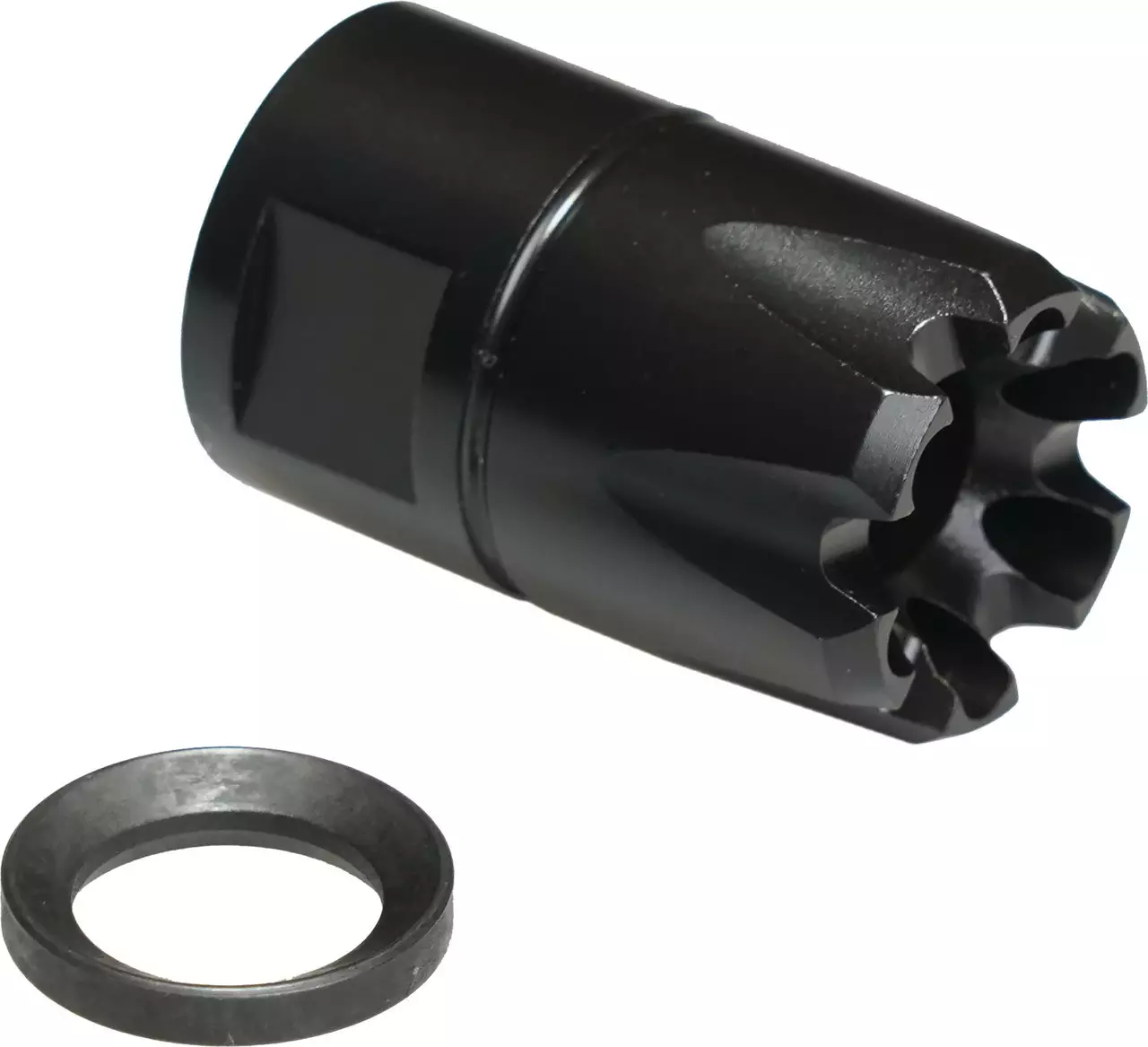 - Operating principle: directs gas and pressure wave forward, helps mitigate muzzle rise